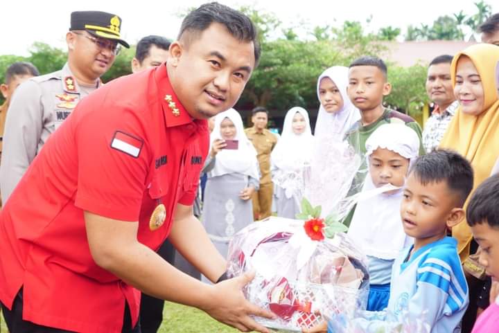 SuhaNews – Bupati Dharmasraya, Sutan Riska Tuanku Kerajaan menyerahkan bantuan seragam sekolah kepada peserta didik jenjang PAUD, SD dan SMP Negeri di Lingkungan Dinas Pendidikan Kabupaten Dharmasraya, Senin, (28/08), di SMPN 2 Pulau Punjung.