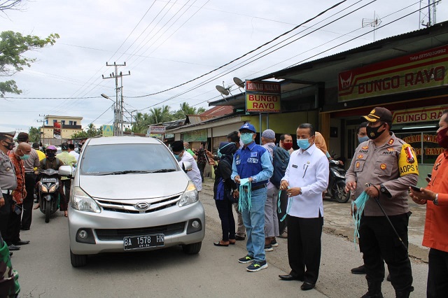 Arosuka, SuhaNews. Usai acara di sekretariat KPUD Kab. Solok, Kapolres Solok AKBP Azhar Nugroho, SH, S.I.K, M.SI bersama Sekda Kab. Solok Azwirman, SE, MM Dandim 0309 Solok LETKOL ARM Reno Triambodo S.Sos M.IPol diwakili oleh PABUNG Solok Kapt. ARH Baskir, Ka. Sat. Pol PP dan Dam Efriadi membagikan masker ke pungguna jalan di depan Pengadilan Negeri Koto Baru, Kamis (10/9).