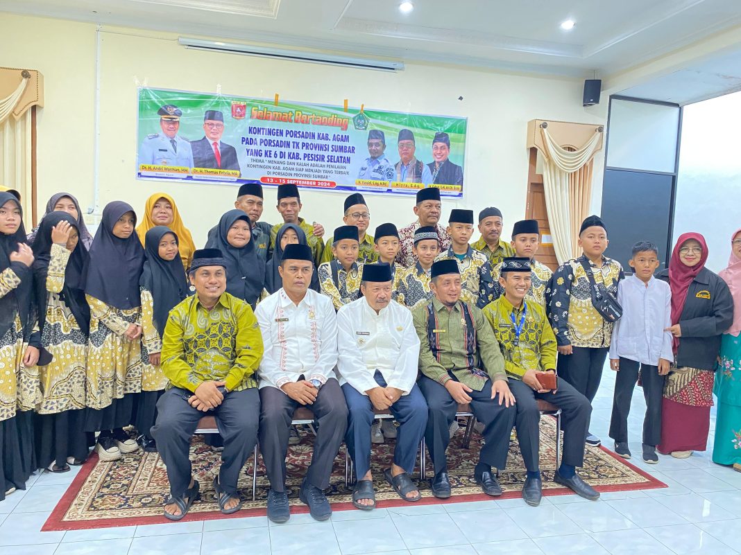Agam, SuhaNews – Kafilah dan Official Pekan Olahraga dan Seni Antar Diniyah (Porsadin) Kabupaten Agam dilepas secara resmi oleh Bupati Agam Dr. H. Andri Warman, MM di Mess Pemda Agam Belakang Balok Bukittinggi pada Jumat Pagi 13 September 2024.