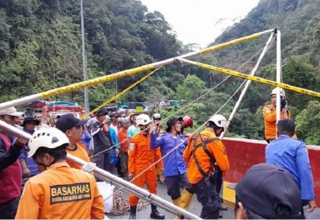 Basarnas Limapuluh Kota yang menerima laporan adanya korban jatuh di jembatan kelok enam, langsung merespon bersama tim gabungan mendatangi lokasi dan mengevakuasi korban.