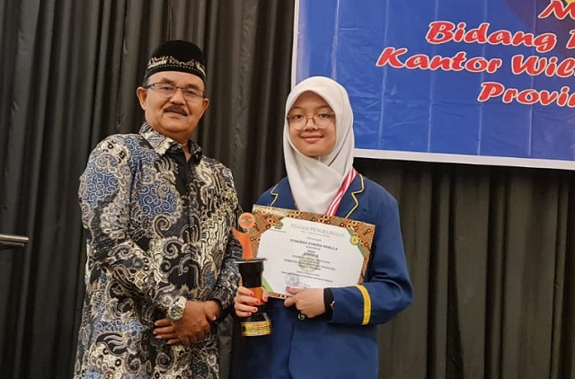 Solok, SuhaNews – Syakirah Syahda Khalila, siswi Kelas IX MTsN 6 Solok (MTsN Talang Babungo) menerima penghargaan Madrasah Award 2023, Kamis (21/12) di Mercure Hotel Padang.