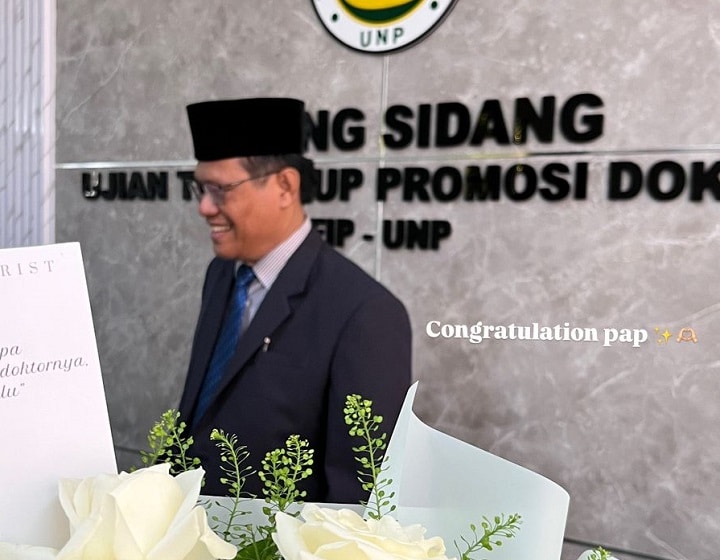 Setelah berhasil mempertahankan disertasinya yang berjudul Pengaruh Kepemimpinan, Budaya Organisasi dan Kepuasan Kerja Terhadap Komitmen Organisasi Guru Madrasah Aliyah Negeri (MAN) di Sumatera Barat, Senin (30/12/2024).