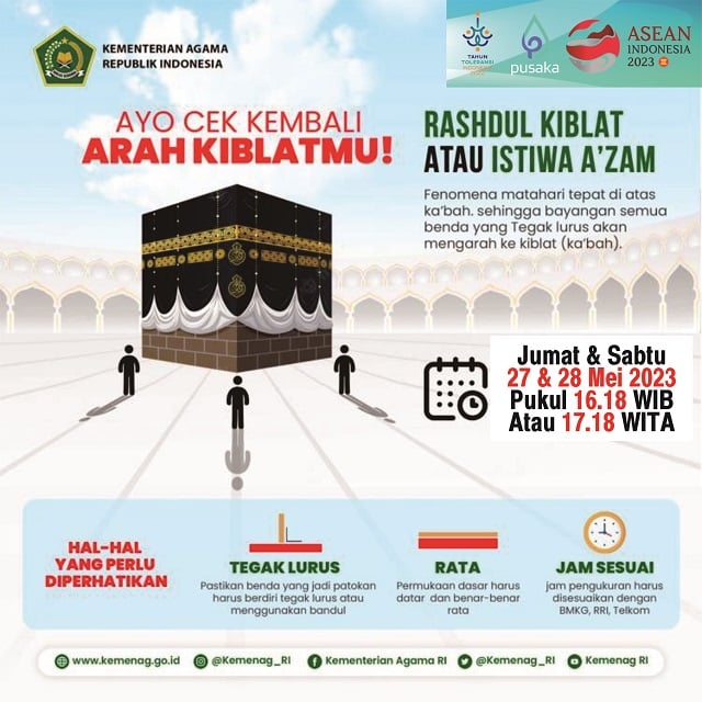 “Pada Sabtu dan Minggu, 27-28 Mei ini bertepatan dengan 7 dan 8 Zulkaidah 1444 Hijriah, pukul 16.18 WIB atau 17.18 WITA matahari akan melintas tepat di atas Ka’bah, pergunakan kesempatan ini untuk mengukur ulang arah kiblat kita,” ajak H. Zulkifli.