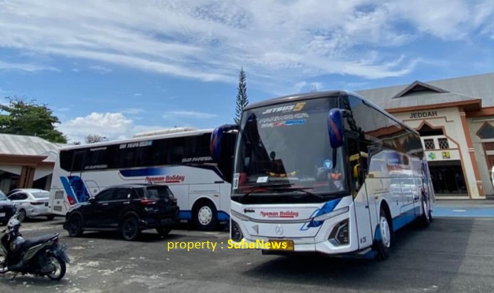 Padang, SuhaNews | Bus Pariwisata Nyaman Holiday dipercaya oleh Garuda Indonesia membawa jemaah haji dari Asrama Haji Tabing (embarkasi Padang) menuju Bandara Internasional Minangkabau pada penyelenggaraan haji 2026 M / 1447 H.