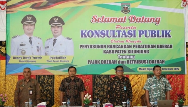 Sijunjung, SuhaNews – Dalam rangka penyusunan Raperda tentang Pajak Daerah dan Retribusi Daerah, Pemerintah Kabupaten Sijunjung (Pemkab) Sijunjung menggelar konsultasi publik, Kamis (08 Desember 2022) di Balairung Lansek Manih Kantor Bupati.