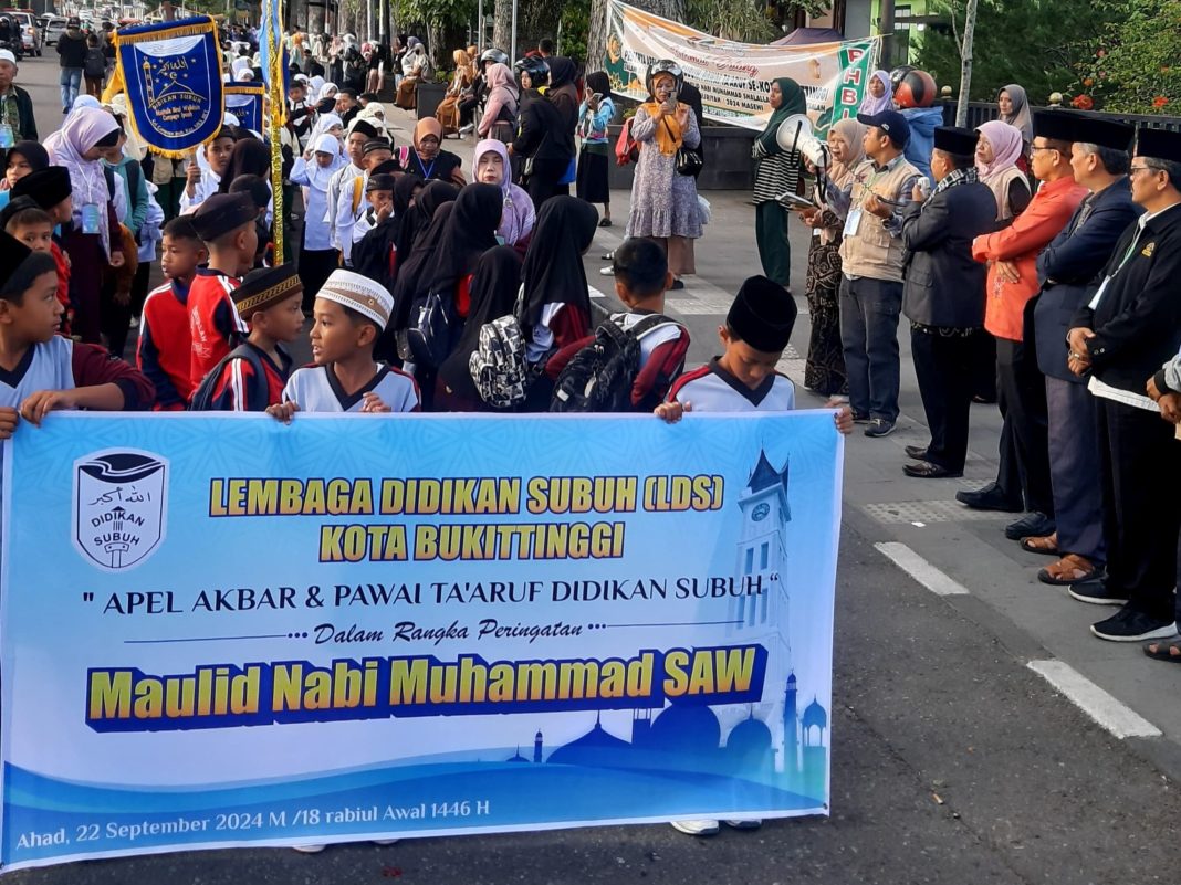 Bukittinggi, SuhaNews – Kepala Kantor Kementerian Agama kota Bukittinggi yang diwakili Kasi Bimas Islam, H. Zulfikar sekaligus Ketua Panitia Hari Besar Islam (PHBI) Kota Bukittinggi bersama Staf Ahli Walikota Bukittinggi H. Johnny melepas kegiatan Pawai Ta’aruf Didikan Subuh Kota Bukittinggi di jalan Sudirman depan lapangan Wirapraja Bukittinggi, Minggu (22/9) bertepatan dengan 18 Rabiul awal 1446 Hijriyah.