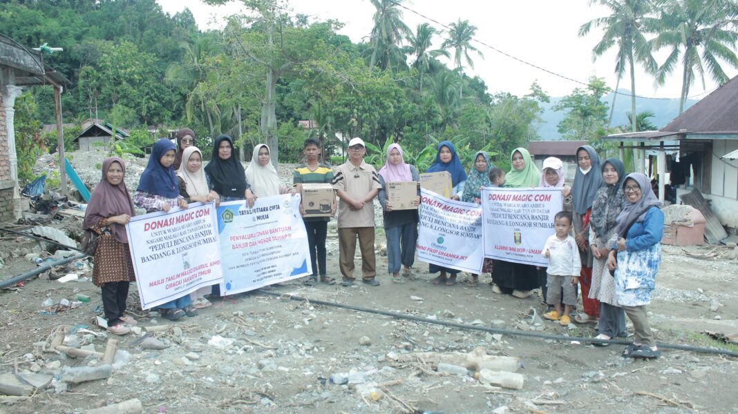 ” Adapun bentuk Donasi yang kita hantarkan hari ini adalah , Magiccom 1.untuk Nagari Selayo Kec.Kubung Kab. Solok, 2 unit dari Hamba Alloh via Wirda ,Badrianti jakarta, 2. Nagari Koto Hilalang Kec. Kubung Kab.Solok 2 unit dari KUA Kubung dan Ivonny Muni S. Farm, 3. Nagari Paninggahan Kec. Junjung Sirih, a. 44 unit (Subarang,Gando dan Muaro) dan Alumni FKIP UHAMKA jakarta b. 5 Unit (Cacang) dari Mairizal dan kawan-kawan, 4. Nagari Malalo Kab.Tanah Datar 13 unit a. 7 unit dari Alumni IMM IKIP / UHAMKA, b. 6 Unit dari Majelis,Taklim Masjid Daarul Khoir Ciracas Jakttim B. Selimut Tidur 25 pcs dan Kain Sarung 10 pcs dari Dansing,Ufalin Tex dan Mailizar Alumni SMKN 2 Solok (Nagari Paninggahan Kec. Junjung Sirih),C. Peralatan Dapur 28 paket dari Gerakan Kebaikan Pondok Kacang Timur Tangsel (Novy Handayani dkk) Nagari Paninggahan Kec. Junjung Sirih ,D. Roti Mises (30 pak),Teh Pucuk (3 Dust) dan Cappucino Cup (3 Dust (Novy Handayani dan Mairizal ” Terang Suhanrizal