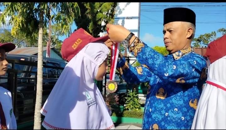 Pengalungan mendali kepada siswa-siswi yang berhasil meraih peringkat 5 Besar dalam KSM Tingkat Kota Bukittinggi langsung di lakukan Kakan Kemenag Kota Bukittinggi, H Eri Iswandi bersama Kasubbag, Kasi dan Penyelenggara Zakat Wakaf. (Syafrial)
