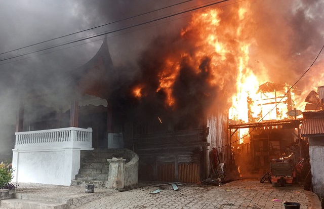 Saat berita ini ditulis, personil Damkar dibantu masyarakat masih berjibaku memamdamkan api yang melalap rumah gadang ini.