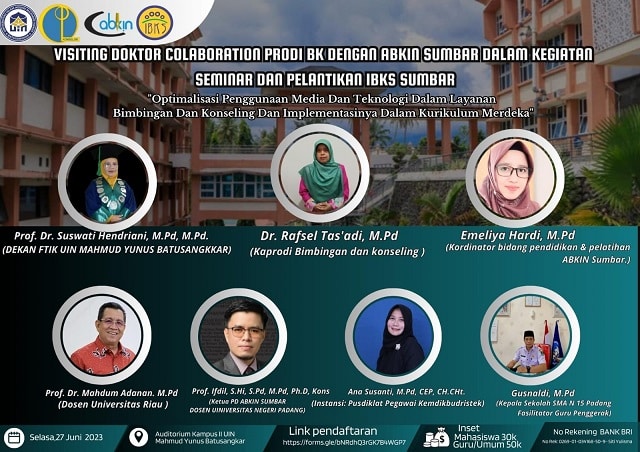 Batusangkar, Suhanews – UIN Mahmud Yunus Batusangkar bekerja sama dengan Pengurus Daerah Asosiasi Bimbingan Konseling Indonesia (ABKIN) akan menyelenggarakan Seminar dan Pelantikan Pengurus Daerah Ikatan Bimbingan Konseling Sekolah (IBKS) Sumatra Barat. Kegiatan ini diadakan di Aula Auditorium Kampus II UIN Mahmud Yunus Batusangkar pada Hari Selasa 27 Juni 2023 mulai pukul 07.30 hingga 17.00 WIB dengan pendaftaran melalui link https://forms.gle/uo5MwjdgyNVjZ1KF7